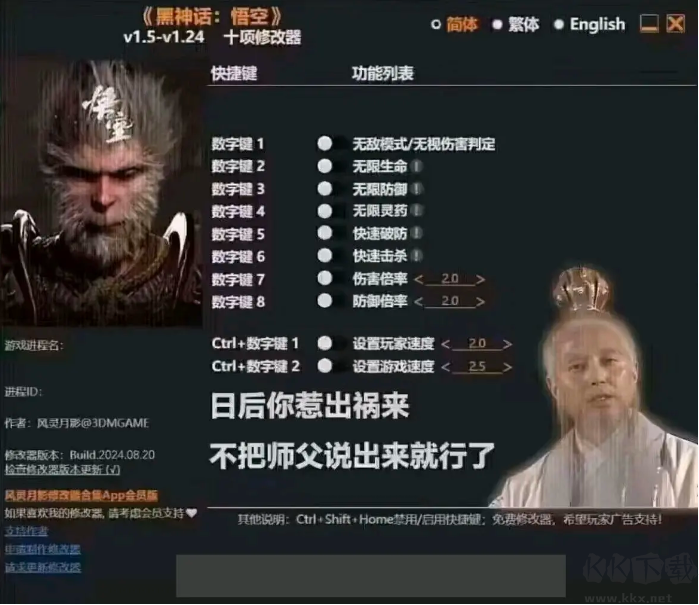 《黑神话:悟空》修改器是一款专为这款热门国产游戏设计的强大辅助工具,旨在帮助玩家突破游戏限制,享受更加自由和个性化的游戏体验。通过使用该修改器,可以畅快的体验极富挑战的游戏内容,让无数玩家沉迷其中。有了这个得力助手黑神话悟空修改器,它能帮你轻松调整难度,让你玩游戏不再抓狂。修改器强大的功能,绝对能让你的《黑神话:悟空》之旅更加顺畅和愉快。别等了,赶紧试试吧!