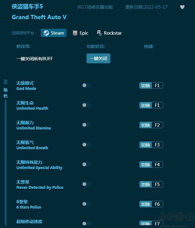 GTA5修改器拥有GTA5游戏的17项游戏修改功能,包括角色无限生命,无警心,武器,武器爆炸,车辆耐久,6警心,超级奔跑等等共17项。有了这些功能,你能够更愉快的在GTA5的世界做你想做的事!感兴趣的朋友不要错过,KK下载站推荐大家下载体验!