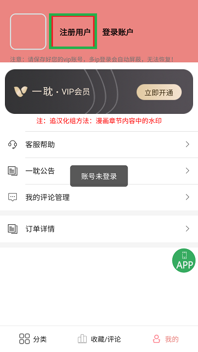4、个人页面中需要点击上方的【注册账号】去进行注册;