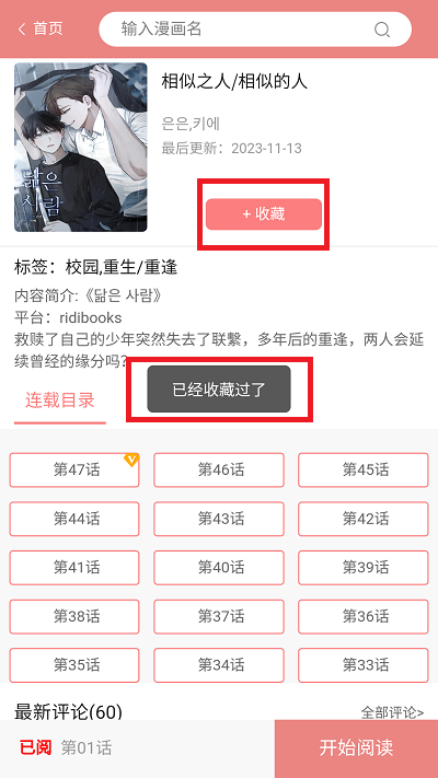 7、找到漫画之后进入到漫画的详情界面,点击上方的【收藏】就可以正常的收藏漫画留着以后欣赏了。