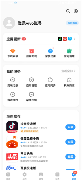 4、管理页面就是我们的个人中心页面,可以在这里查看自己的下载安装记录、应用卸载、空间清理等功能。
