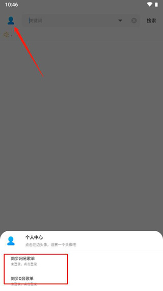 2、如下图所示,点击头像按钮,屏幕下方就会弹出一个小页面,是我们的个人中心,支持同步网易云音乐、QQ音乐,用户可以根据自己的需求选择;