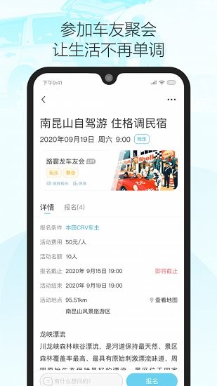 【发布活动】:发布自驾、运动、聚餐等活动,随时可邀请车友来陪你一起玩