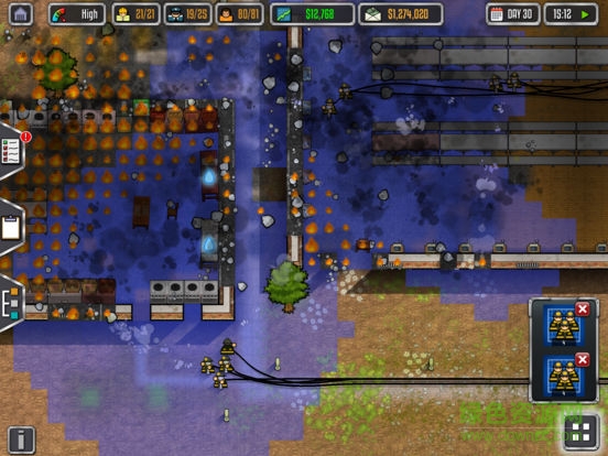 “铲平”可以拆掉已有建筑(可以用来拆掉墙壁或地板,但是会把拆掉的区域变成室外区域)。这项任务将通过工人来完成。如果你只是想删除一堵墙,但想让拆掉墙的地方变成一个“室内区域”,你应该使用“建材”菜单里的“清除室内区域”工具。