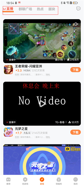 4、点击发现栏目,可以看看上分为直播、群聊广场、热点、板块四个栏目,用户可以在这里观看自己喜欢的游戏直播,游戏热点等,还能在群聊广场中和广大网友进行交流讨论,一起进入房间畅聊;