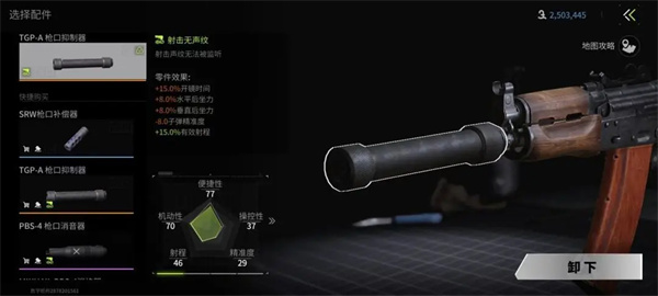 主要是消音器,消焰器,补偿器和螺纹保护器,对于步枪和狙击枪一般选择消音器,方便在中远距离射击中掩盖声纹,对于冲锋枪这种贴脸突突的则没那个必要,一般选择螺纹保护器,一般来说,枪口的属性有降低后坐力,影响射程,增加开镜时间,对于步枪的改装思路以降低后坐力为核心,而狙击枪则以消音消焰的属性和增加射程为核心。