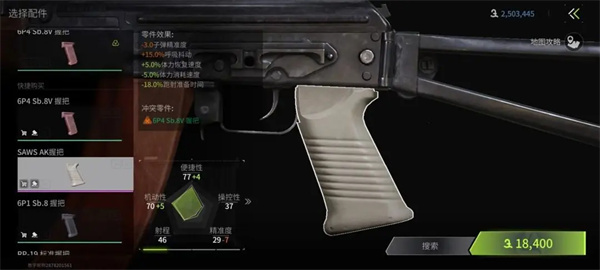 分为前握把和后握把,前握把是控制后坐力的关键,对于步枪而言有一个高级的垂直握把是非常关键的。后握把主要是对于开镜时间和体力消耗的影响,选择红色以上的就几乎没有debuff。