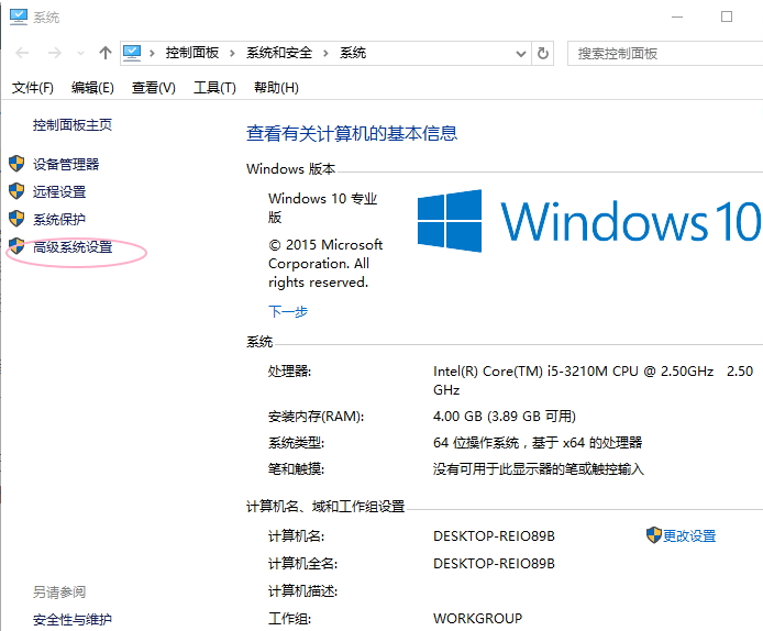 1.打开“控制面板”–>“系统与安全”–>“系统”,点击左侧的“高级系统设置”,弹出“系统属性”面板。