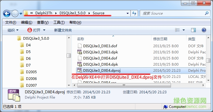 3、在Delphi XE4 的IDE中打开DISQLite3安装目录中的Source目录中的DISQLite3_DXE4.dproj文件,如下图所示:
