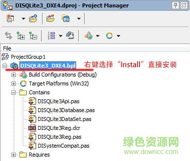 4、打开.dproj文件后在project Manager中点击DISQLite3_DXE4.bpl上点击右键Install,至此已经安装完毕该组件了。