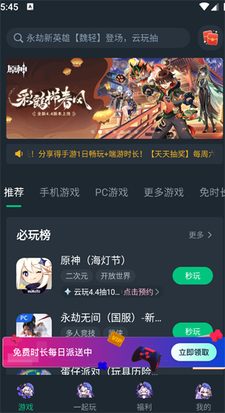 网易云游戏安装手机版让大家可以在线玩网易旗下的手游和端游,为广大的爱玩网易游戏的朋友带来了方便,通过云游戏中心可以了解相关网易的重要游戏新闻,并且在第一时间就可以进行试玩,官方正版体验速度也是极其的快速,让你感受不一样的游戏乐趣。
