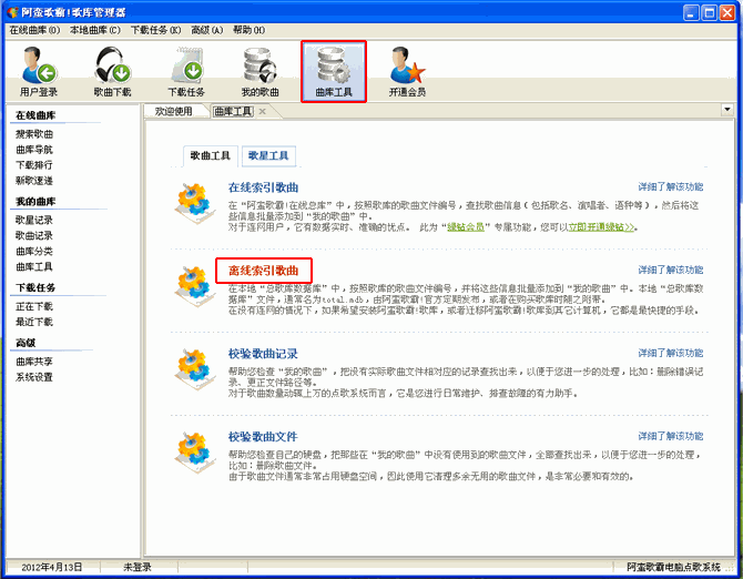 1、打开“阿蛮歌霸!歌库管理器”→ “曲库工具”→ “歌曲工具”→“离线索引歌曲”。