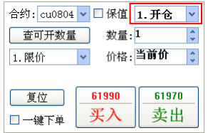 5. 点击“复位”按钮,交易界面将恢复为“开仓”,数量恢复为该合约的默认手数, 价格恢复为“限 价”、“当前价”。