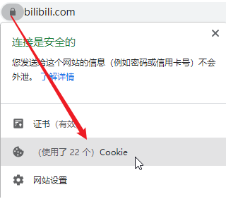 在浏览器中登录Bilibili站点后,点击浏览器网址栏左侧的图标,在弹出面板中,点击Cookie。