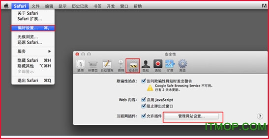 ①打开【safari浏览器】--【点击Safari】--【偏好设置】--【安全性】--【管理网站设置】