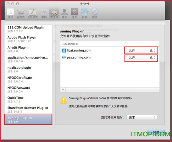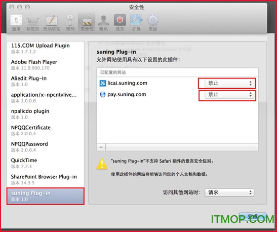 ②选择【suning Plug-in】,将下图右边红框框出的下拉框由“禁止”设置为“允许”