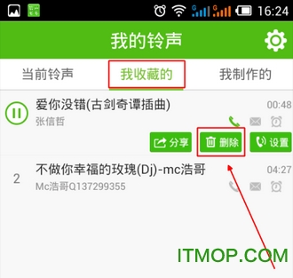 一般你设置过的铃声会在—“我的收藏”中出现点击—“删除”