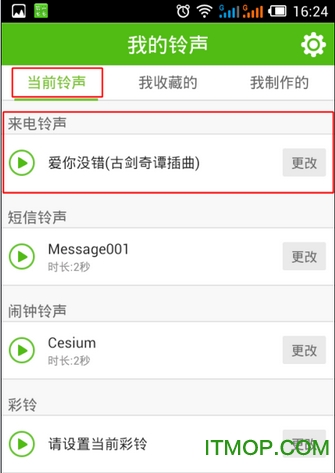 2、进入我的铃声页面后再点击——“当前铃声”——“来电铃声”,如果你不喜欢当前的铃声,然后点击—“更改”