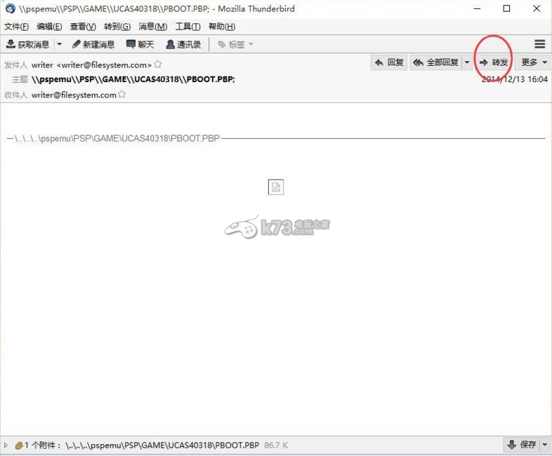 5.用thunderbird之类的邮件管理软件打开,点击右边的转发,收件人填入邮箱A,点发送