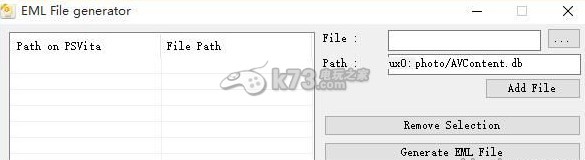 4.打开eml生成器file一栏选择步骤2中得到的PBOOT.PBP,在path一栏中填入pspemu/PSP/GAME/种子游戏的ID(Title‘ID)/PBOOT.PBP (红色字部分,不含空格),点击add file,再点击Genetrate EML File 选择一个目录保存,名称任意。