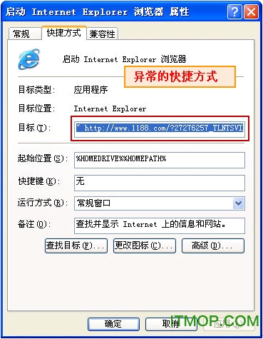 1、快速启动中的 IE快捷方式的“目标”被修改。 .