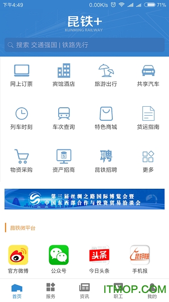 昆铁+app是一款由昆明铁路局打造集职工服务、公众服务为一体的综合平台,用户不仅能订票,还能找酒店,找餐厅,发货运,是12306最好的衔接平台!职工也能工作用,感兴趣的直接来IT猫扑下载!