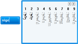 输入字母后候选框中显示的黑体词是和输入码所匹配的蒙古文词,而灰色词是部分匹配词。用户可依据灰色词下面的输入码提示继续输入,最多显示随后的三个字母,其中大写字母是下一个音节首字母,用户可直接输入大写字母快速录入下一个音节,例如用户要继续录入yabvba时,在ybv基础上直接输b,即可。