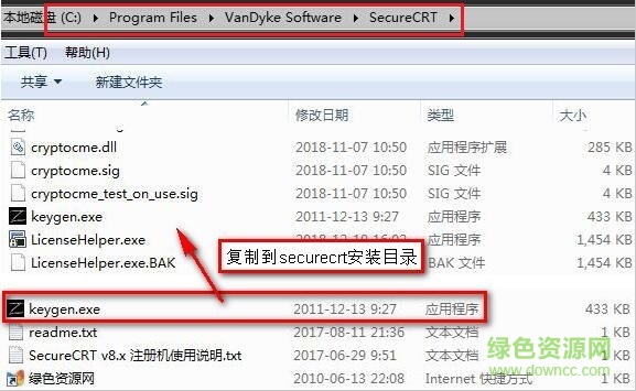 1.打开安装包中的“8.x 注册机”文件夹,将“keygen.exe”复制到securecrt安装目录(默认路径为:C:\Program Files\VanDyke Software\SecureCRT)