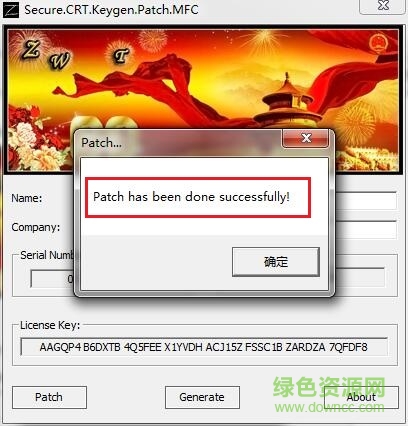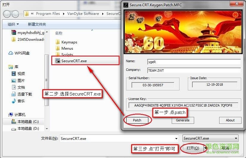 3.然后点击“patch”,选择“SecureCRT.exe”可执行文件,点击“打开”,会有“patch has been done successfully!”的提示(按下图进行操作)