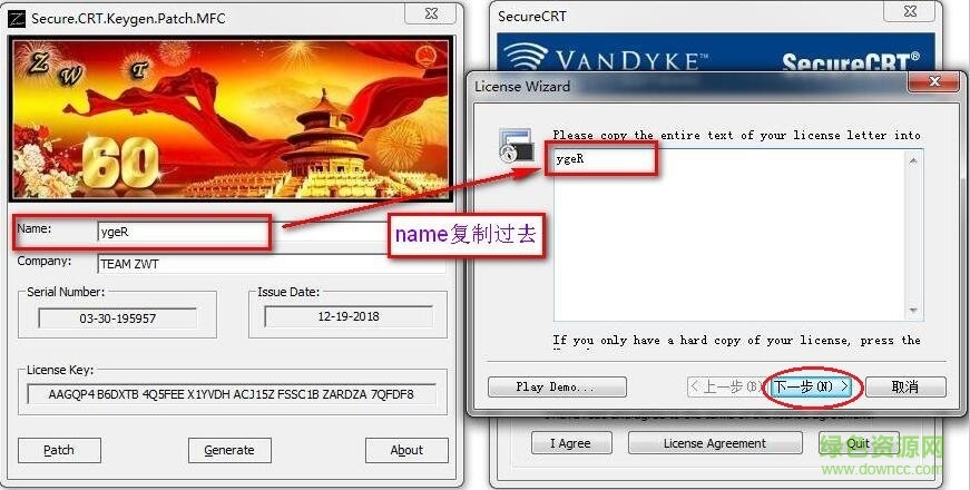 6.将注册机中“name”信息复制到软件界面中(如图),然后点“下一步”