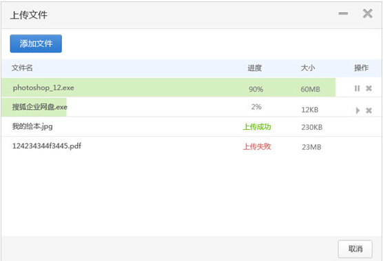 弹出上传对话框,点击“添加文件”,选择要上传的文件,上传列表显示文件名、进度、大小,上传过程中可以暂停/恢复上传、取消上传.