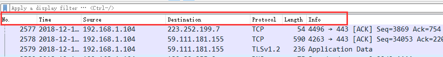 3. Packet Details Pane(数据包详细信息), 在数据包列表中选择指定数据包,在数据包详细信息中会显示数据包的所有详细信息内容。数据包详细信息面板是最重要的,用来查看协议中的每一个字段。各行信息分别为