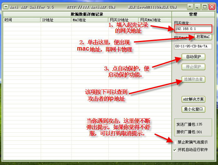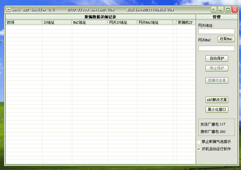 这里推荐Anti ARP Sniffer该软件最大的特点是在系统内核层拦截虚假ARP数据包,并且主动通告网关本机正确的MAC地址,这样可以保障安装该软件的电脑正常上网,并且拦截外部对本机的ARP攻击。
