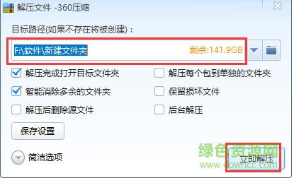 2.我们点击下单栏中的“解压到”选项,就会进入到下图中的界面,我们可以设置解压的保存位置以及其他的一些选项,如果你不了解,保持默认就可以,然后点击下方的立即解压就可以了。