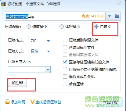 2.进入到创建压缩文件界面,我们在压缩配置选项中点击“自定义”,然后在界面下方就可以看到有“加注释”选项,我们点击进行下一步。