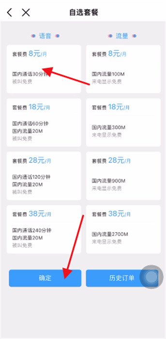 5、最后,能够看到这里有很多套餐,如8元、38元等等,选择之后点击【确定】即可直接办理。