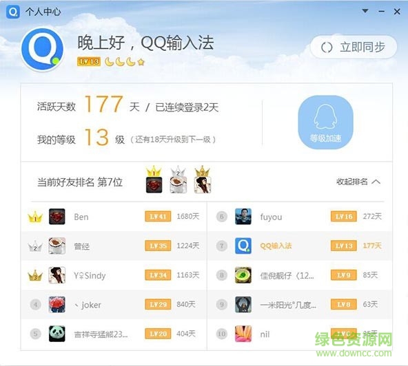 通过登录QQ账号,可以查看您使用QQ输入法的QQ好友等级排名。点击“查看排名”,可显示您的QQ好友中排名前十的好友列表,如果您不在好友排名的前十名内,将显示您QQ输入法排名前九位的好友,以及您自己的排名情况。