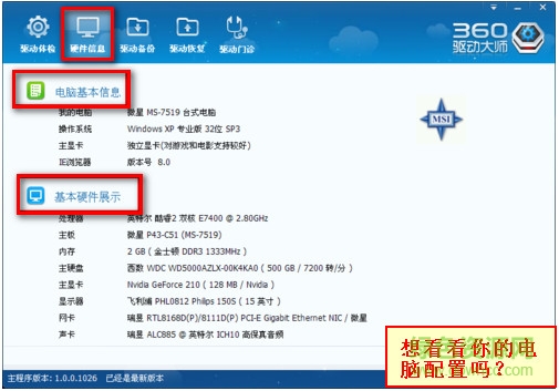 “硬件信息”,现在的驱动也基本实现了这个功能,但是本人觉得360驱动大师的硬件信息显示的很清晰,如果你对你电脑的硬件设备不是很了解的话,可以用360驱动大师检测下。