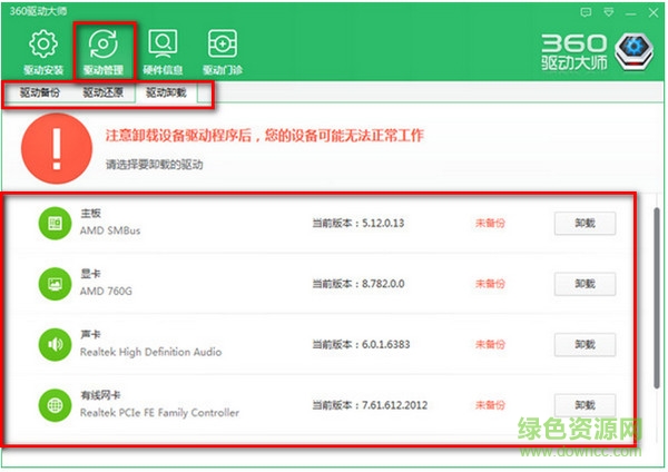 接下来是“驱动管理”,驱动备份会在我们工作或者学习中用到;“驱动还原”、“驱动卸载”,如果觉得更新的驱动不要用,可以将驱动还原或者将驱动卸载了再装其他的。