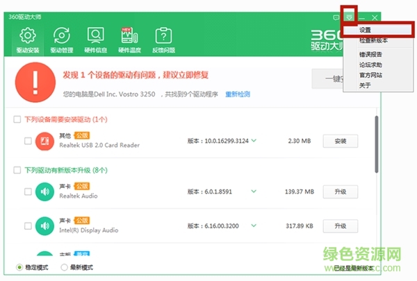 1.点击360驱动大师右上角小箭头,在下拉菜单中点击【设置】;