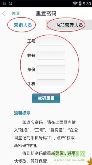 如遗忘密码,请在上面框内输入“姓名”、“工号”、“身份证”、“在公司登记的手机号码”后,点击“获取新密码”按钮。