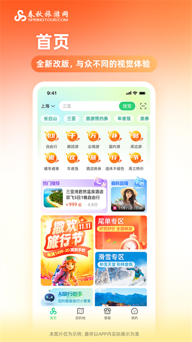 春秋旅游是一款旅游服务手机工具,是出门旅游的必备神器!软件可以查询预订机票、酒店、景点门票等,支持在线预订国内旅游,海外度假和景点门票。春秋旅游国内、国外都有覆盖到,春秋旅游的信息全面有用,时不时有打折信息,春秋旅游还有一个语音搜索功能,非常方便。