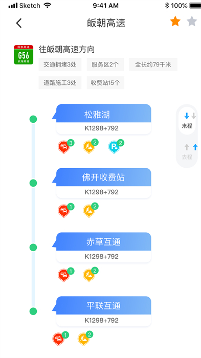 1.高速路网:包括高速简图、分流预案、高速列表三个模块。点击进入“高速简图”模块,全省高速公路实时路况即刻一览无余。通过区分红黄绿灰四种不同区块,全省高速路段的事故、施工及拥堵等通行状况一目了然。