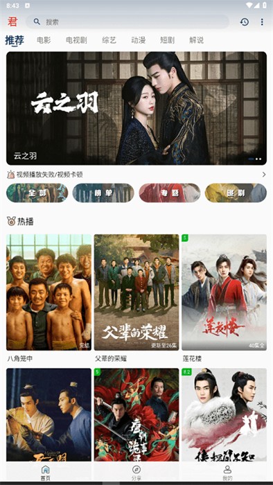 君离影视是一款免费的手机影视剧观看软件,不管你是想追剧、看电影,还是喜欢动漫,在这里都能满足我们的需,这款app内拥有海量影视资源,更新速度快,画面清晰流畅同时还可以自由选择播放器和清晰度,使你能轻松享受高品质影视娱乐。