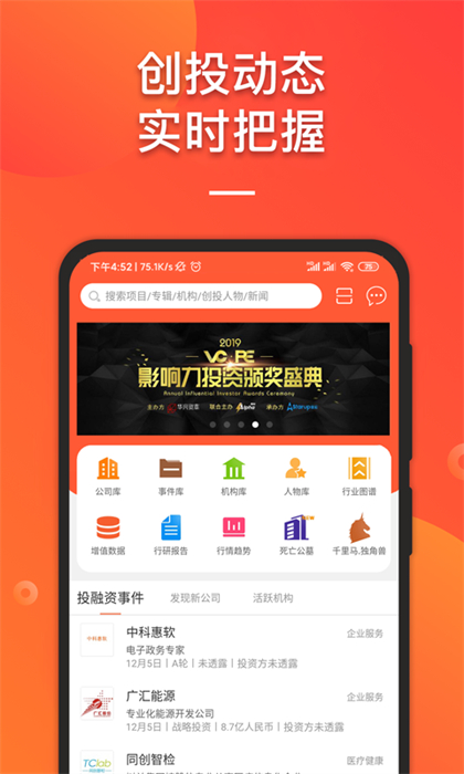 IT桔子app是整合了互联网创业公司数据库和投融资数据库。为用户提供海量创业公司数据,让你发现有潜力的合作伙伴,更准确的做好投资。还提供最新最全的投资新闻,让你把握好每一投资的机会。赶快下载体验吧!