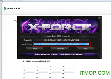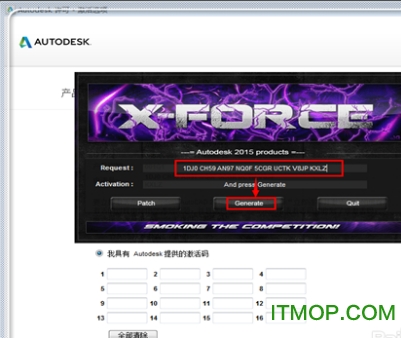 11、这时候返回到第8步的注册界面,复制“申请号”,然后进入这里的注册机,先点击一下“patch”,然后在“request”后面的方框中粘贴刚才复制的”申请号”,点击“generate”。