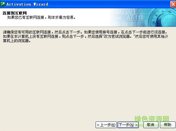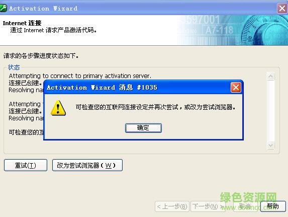 3.在出现“连接到互联网”界面后需要禁用你的网卡或拨掉你的网线(如果是无线网卡请关闭它,总之要断开所有的网络,否则注册向导会在自动在Internet上尝试激活,这样就不会出现输入激活码的界面了),然后按“下一步”。因为没有找到网络,激活向导会出现提示,不用理会它直接按“确定”。然后点击“改为尝试浏览器”按扭,这时就会出现我们想要的激活码输入界面。