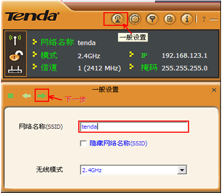 四、(1)、切换AP模式成功后,在设置界面里点击“一般设置”--- 填写“AP的网络名称(SSID )”--“下一步”。如下图所示:
