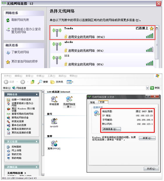 第五步:验证AP模式是否设置成功。在附近通过另一台电脑搜索AP的无线信号,连接成功后,获取的IP地址为软AP分配的IP地址。如下图所示:
