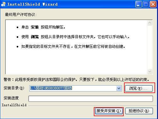 双击下载后的文件,出现解压窗口(下载的文件是压缩格式,需要解压后再运行安装程序),点击浏览按钮可以选择解压路径,如没有选择,文件将解压到当前目录,点击接受并安装,开始解压,如图: